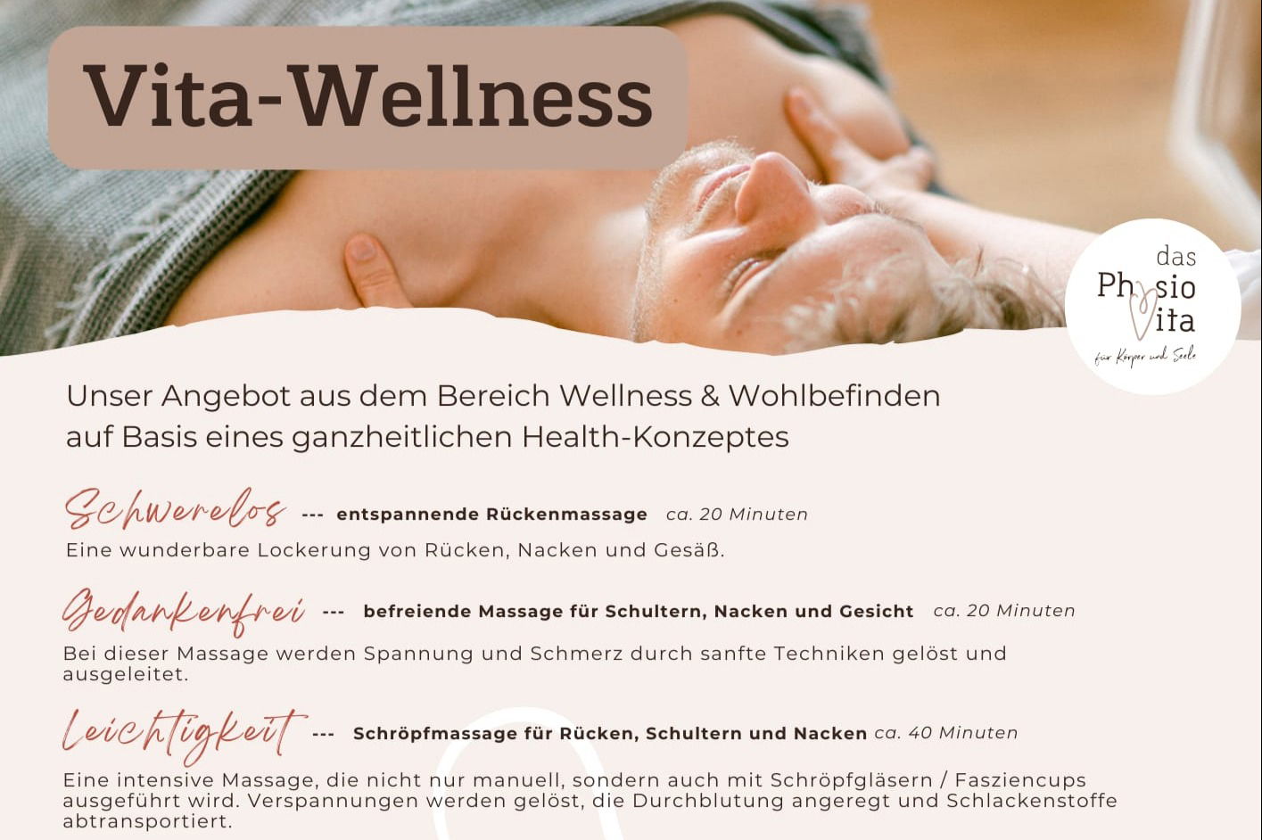 Das Wort Physio kommt aus dem griechischen und bedeutet Natur. Das lateinische Vita steht für Leben. In unserer Praxis für Physiotherapie, Yoga und Wellness steht die Kombination dieser beiden Begriffe für Lebendigkeit und Aktivität, aber auch für Achtsamkeit und Rückzug. Unser ganzheitliches Konzept beinhaltet den Blick auf Körper und Seele.